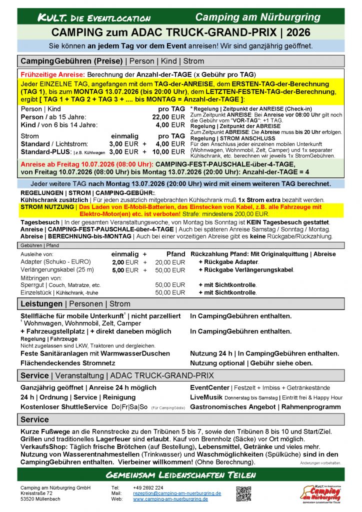 Für die Veranstaltung Truck Grand-Prix bieten wir das Abstellen an. Dieses ist bis Sonntag 05.07.2026 ca. 18:00 / 19:00 Uhr möglich! Es wird vom Tag des Abstellens bis 1 Tag vor Ihrer regulären Anreise oder Beginn der Fest-Pauschale pro abgestelltem Gegenstand pro Tag 22,00 EUR berechnet. Das Abstellen erfolgt ohne Strom! Bitte an der REZEPTION melden! Ab dem 06.07.2026 ist kein Abstellen mehr möglich nur noch ein normaler Check-in! |