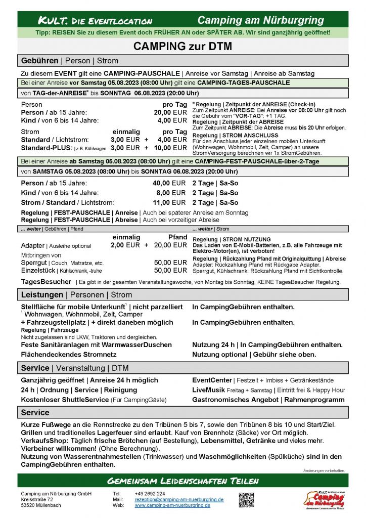 CAMPING – hier sind Sie genau richtig, auf dem offiziellen Campingplatz – KULT. DIE EVENTLOCATION direkt an der Grand-Prix-Strecke angrenzend der Tribünen T5, T6, T7, T8 und seit 1984 ein fester Bestandteil für alle Nürburgring Fans.