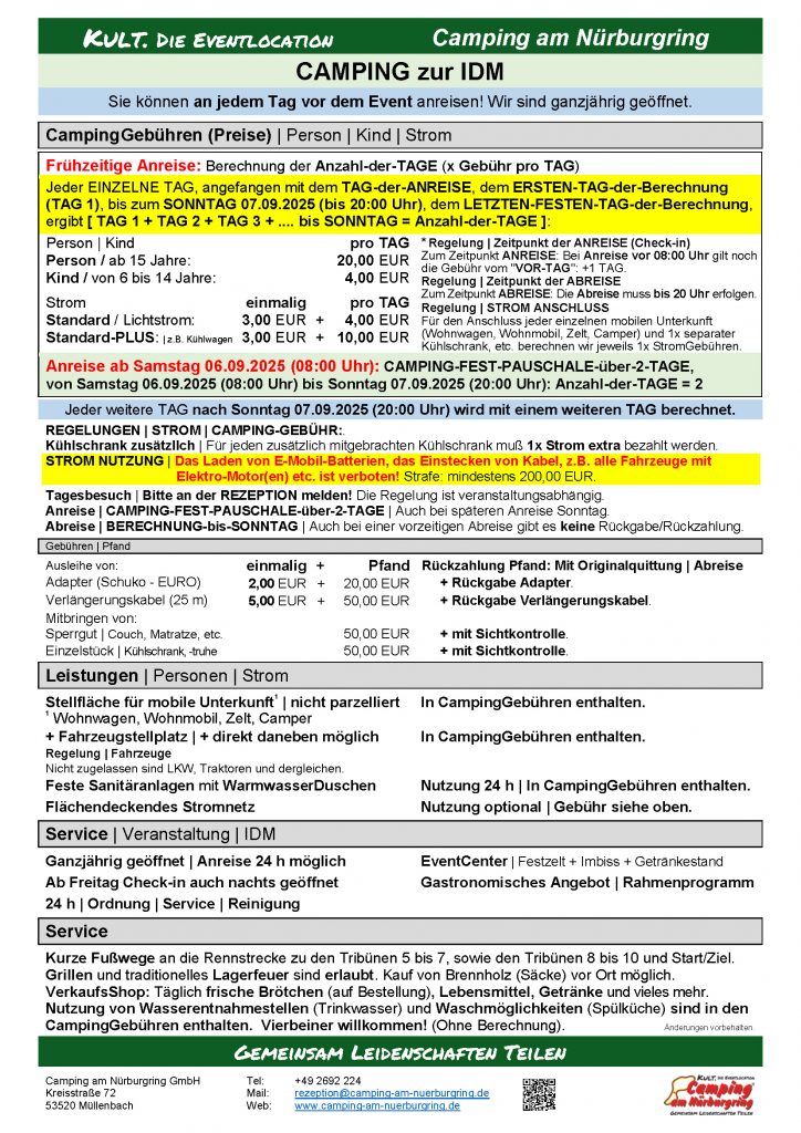 CAMPING – hier sind Sie genau richtig, auf dem offiziellen Campingplatz – KULT. DIE EVENTLOCATION direkt an der Grand-Prix-Strecke angrenzend der Tribünen T5, T6, T7, T8 und seit 1984 ein fester Bestandteil für alle Nürburgring Fans.