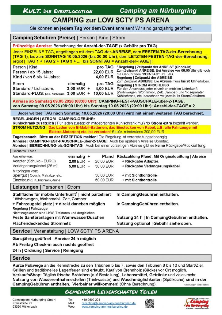 CAMPING – hier sind Sie genau richtig, auf dem offiziellen Campingplatz – KULT. DIE EVENTLOCATION direkt an der Grand-Prix-Strecke angrenzend der Tribünen T5, T6, T7, T8 und seit 1984 ein fester Bestandteil für alle Nürburgring Fans.