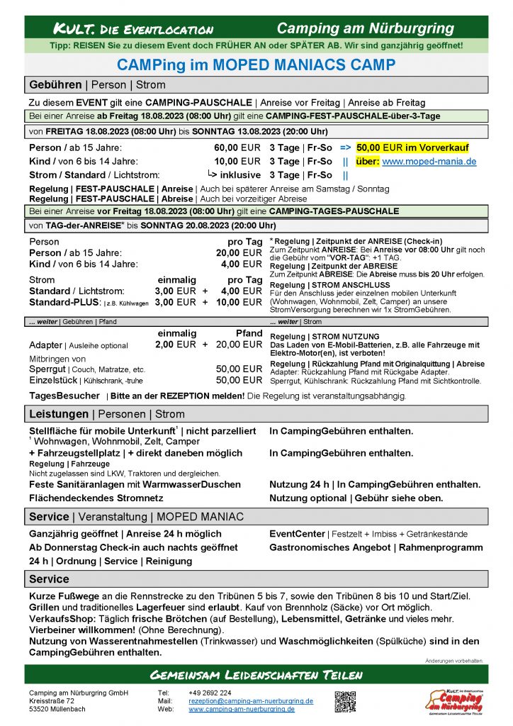– Freie Stellplatzwahl in Eurem MOPED MANIACS CAMP, mit direktem Zugang zum “Moped Mania 2023“, sowohl mit Moped als auch zu Fuß.